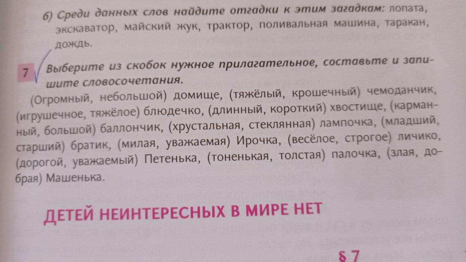 Огромный домище, крошечный чемоданчик, игрушечное блюдечко, длинный хвостище, карманный баллончик, стеклянная лампочка, младший братик, милая Ирочка, весёлое личико, дорогой Петенька, тоненькая палочка, добрая Машенька.