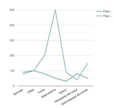 Сколько заяц и волк вместе потратили денег на обед? Волк- синяя линия, заяц- зеленая.