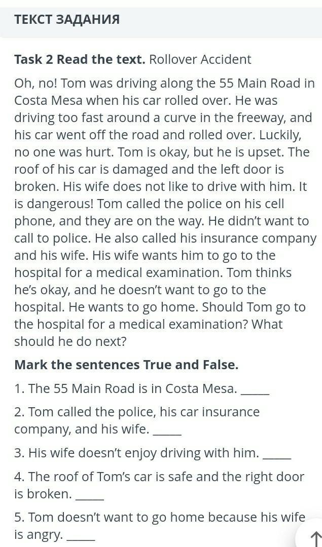 Oh, no! Tom was driving along the 55 Main Road in Costa Mesa when his car rolled over. He was driving too fast around a curve in the freeway, and his car went off the road and rolled over. Luckily, no one was hurt. Tom is okay, but he is upset. The roof of his car is damaged and the left door is broken. His wife does not like to drive with him. It is dangerous! Tom called the police on his cell phone, and they are on the way. He didn’t want to call to police. He also called his insurance company and his wife. His wife wants him to go to the hospital for a medical examination. Tom thinks he’s okay, and he doesn’t want to go to the hospital. He wants to go home. Should Tom go to the hospital for a medical examination? What should he do next?