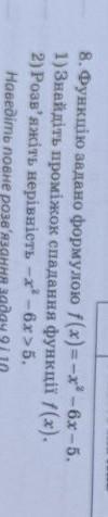 при х∈[-3+∞) функция убывает. это 8 класс, то найдем абсциссу вершины параболы, заданной формулой f(x)=-x²-6x-5, по формуле х=-b/2a=6/(-2)=-3, т.к. а=-1, то ветви параболы направлены вниз, поэтому функция убывает при х∈[-3+∞)