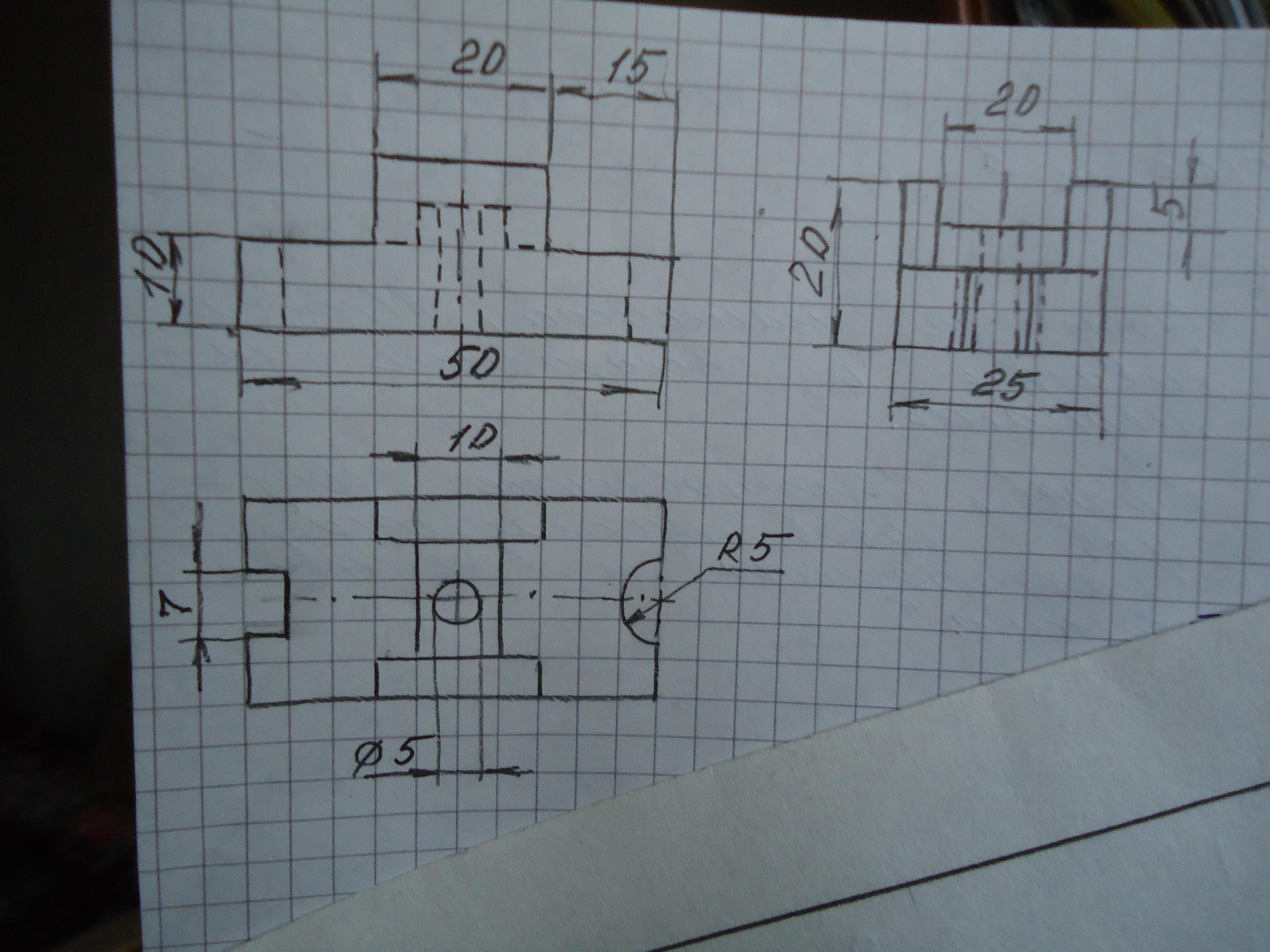 Чертёж детали из трёх проекций смотрите на фото. Размеры можете увеличить в два раза, будет лучше.