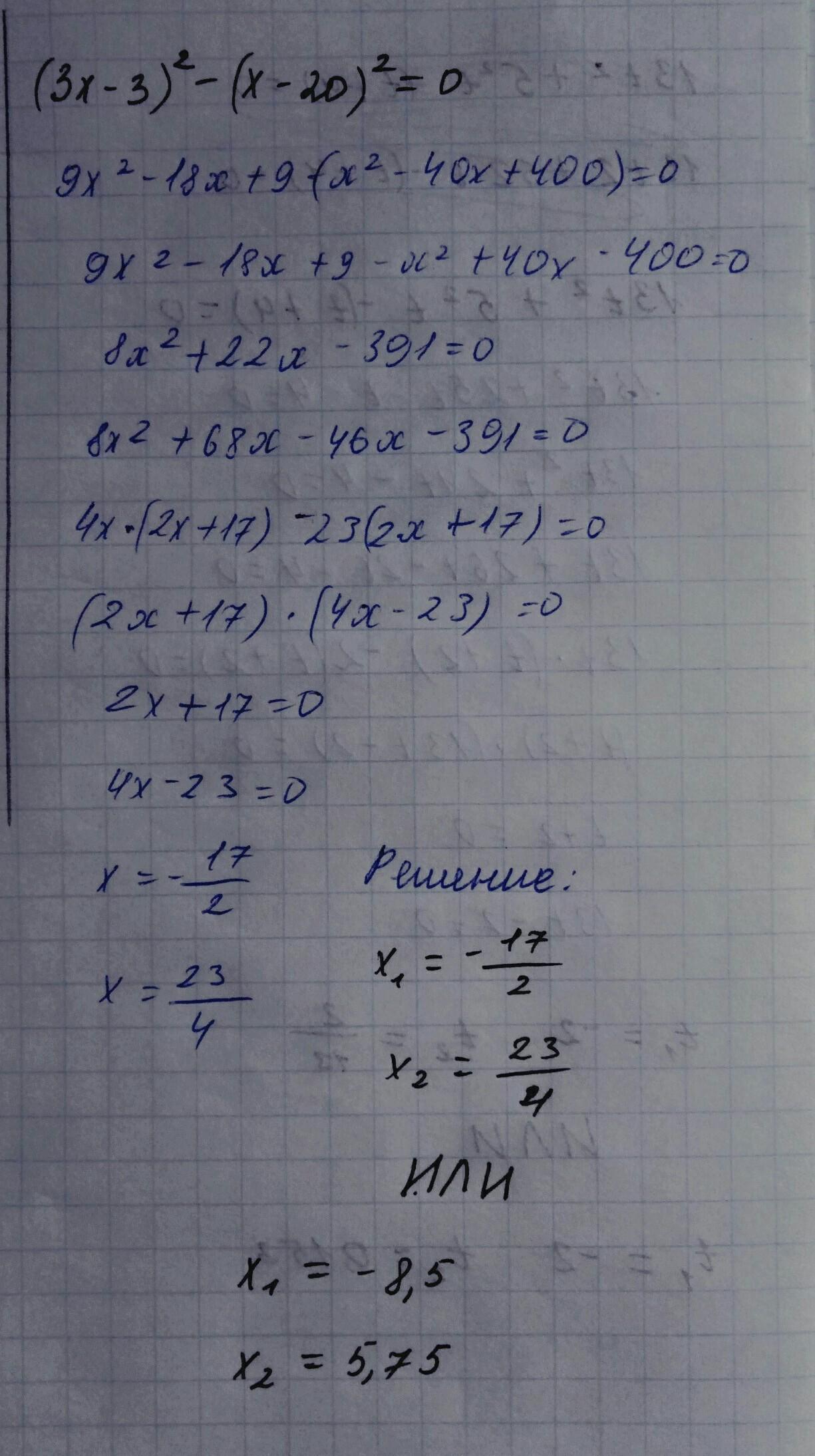 (3x−3)2−(x−20)2=0.
