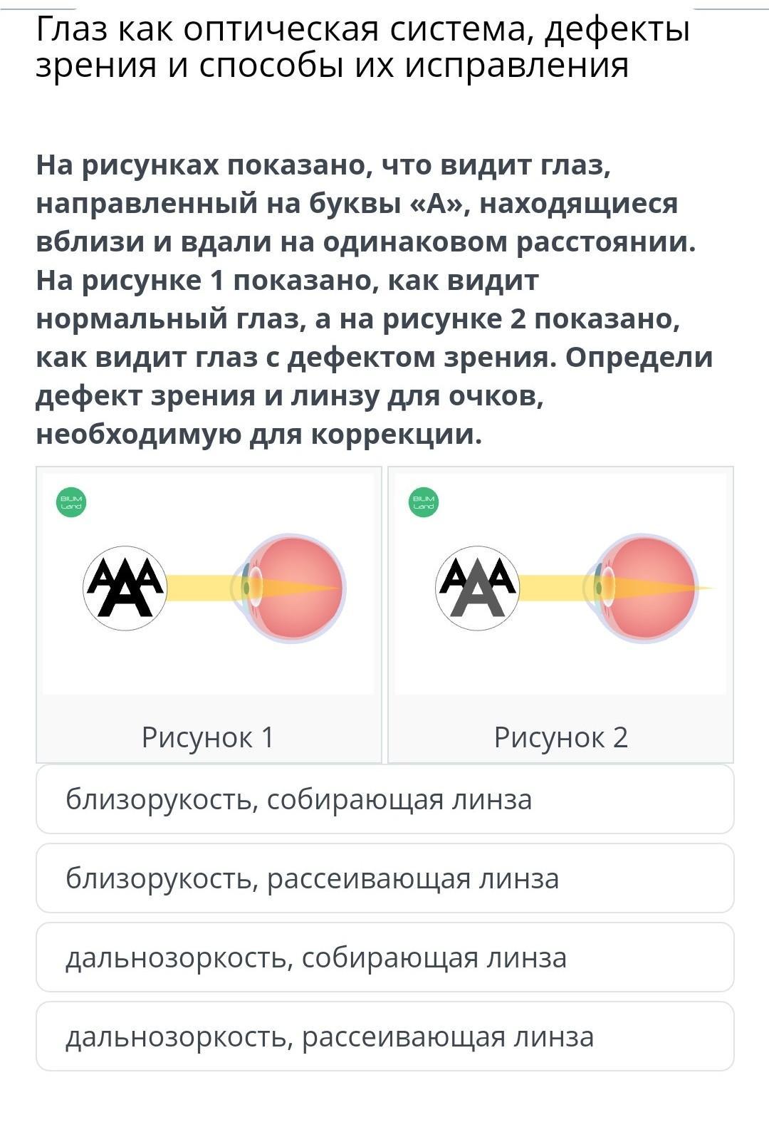 На рисунках показано, что видит глаз, направленный на буквы «А», находящиеся вблизи и вдали на одинаковом расстоянии. На рисунке 1 показано, как видит нормальный глаз, а на рисунке 2 показано, как видит глаз с дефектом зрения. Определи дефект зрения и линзу для очков, необходимую для коррекции.