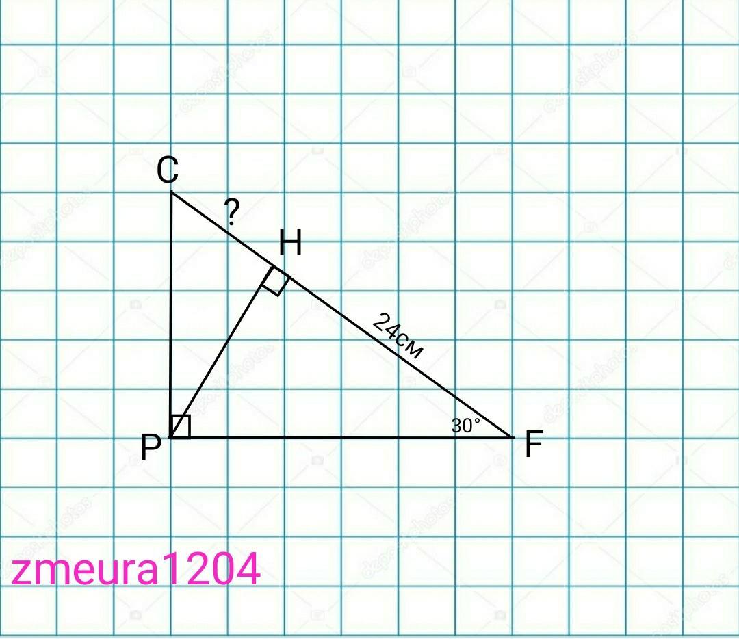 В прямоугольном треугольнике FPC, с прямым углом P, острый угол F равен 30°. РН – высота. Найдите длину отрезка CН (в см), если FН = 24 см.