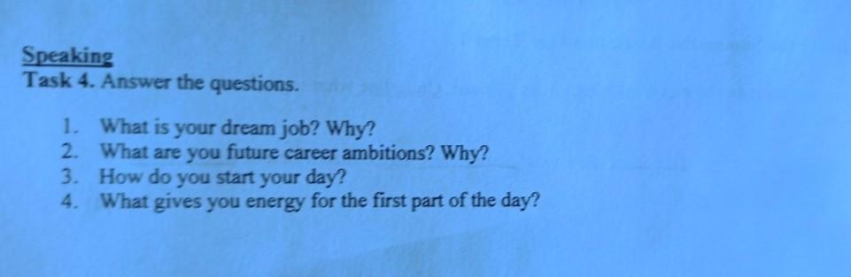 1. What is your dream job? Why? 2. What are you future career ambitions? Why? 3. How do you start your day? 4. What gives you energy for the first part of the day?