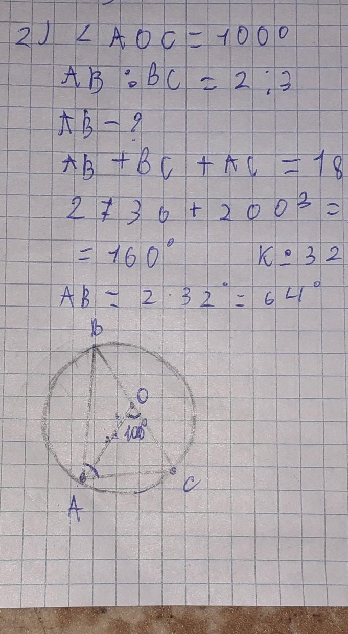 В окружность с центром О, вписан треугольник АВС так, что < АОС =100⁰, ∪ АВ:∪ ВС=2:3. Найдите величину дуги АВ.