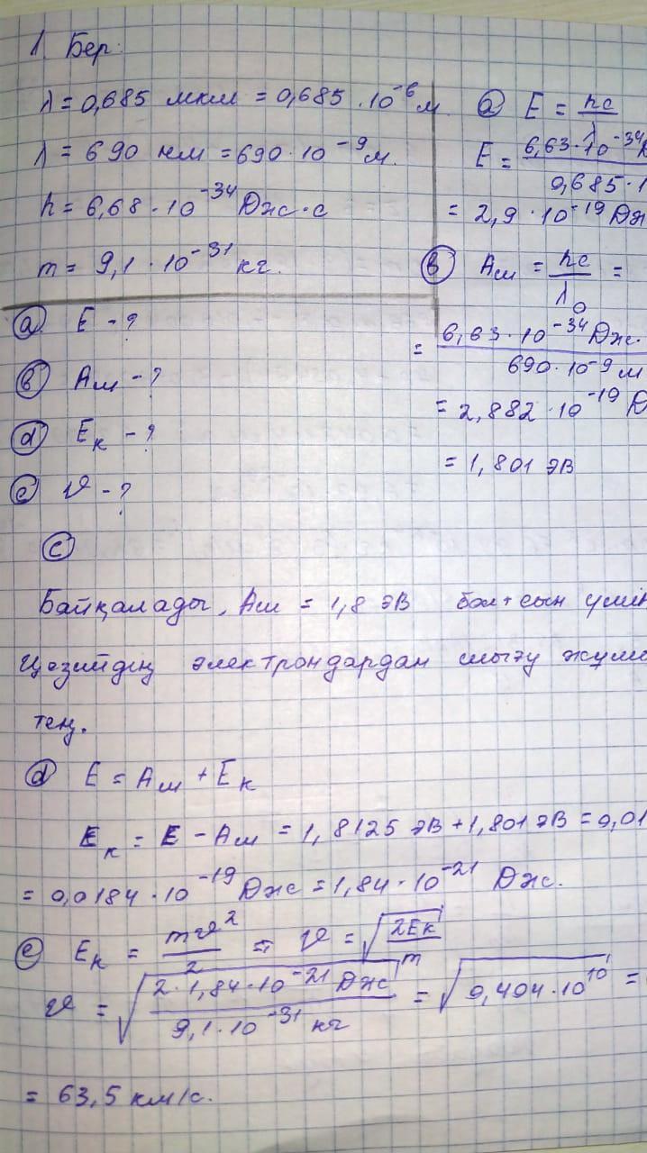 Длина волны жары света, падающего на поверхность цезия, составляет 0,685 мкм. Красный предел фотоэлектрического эффекта для цезия составляет λ0 = 690 нм. Постоянная Планка составляет 6,63 ∙ 10-34 Дж с, масса электрона 9,1 ∙ 10-31 кг. а) Определить энергию падающего света