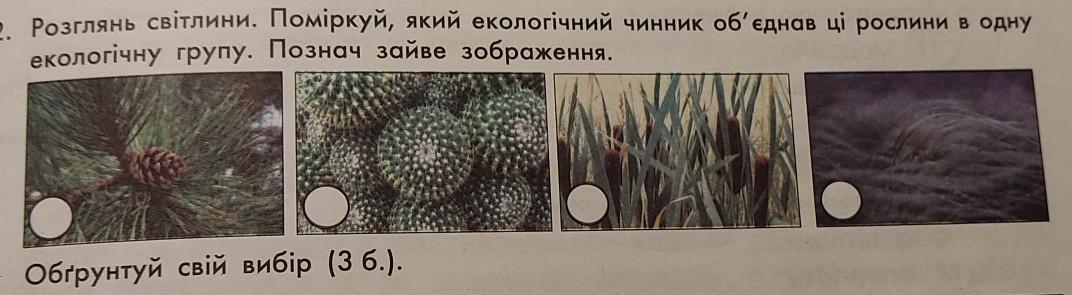 розглянь світлини, поміркуй який екологічний чинник об'єднав ці рослини в одну екологічну групу Познач зайве зображення
