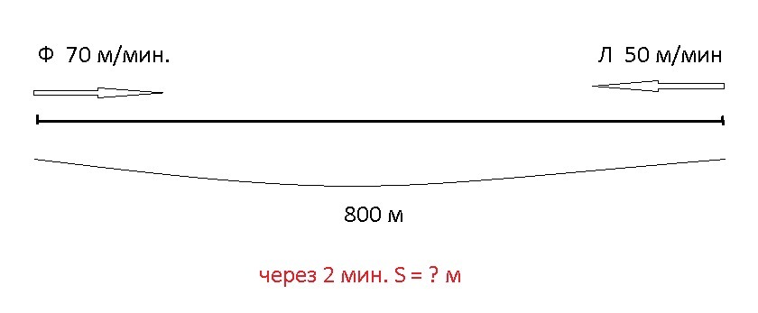 Федор и лена идут навстречу друг другу по лесной просеке.федор идет со скоростью 70м/мин, а лена 50 м/мин.какое расстояние будет между ними через 2 мин, если на данный момент между ними 800 м? Выполни схему и реши задачу разными способами.
