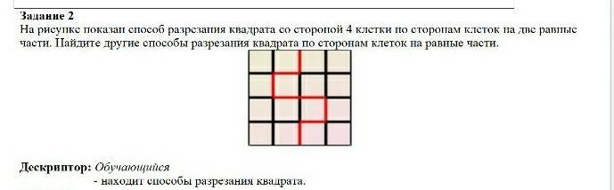 СРОЧНООООООО!!!!!!!!!!На рисунке показан способ разрезания квадрата со стороной 4 клетки по сторонам клеток на две равные части. Найдите другие способы разрезания квадрата по сторонам клеток на равные части.