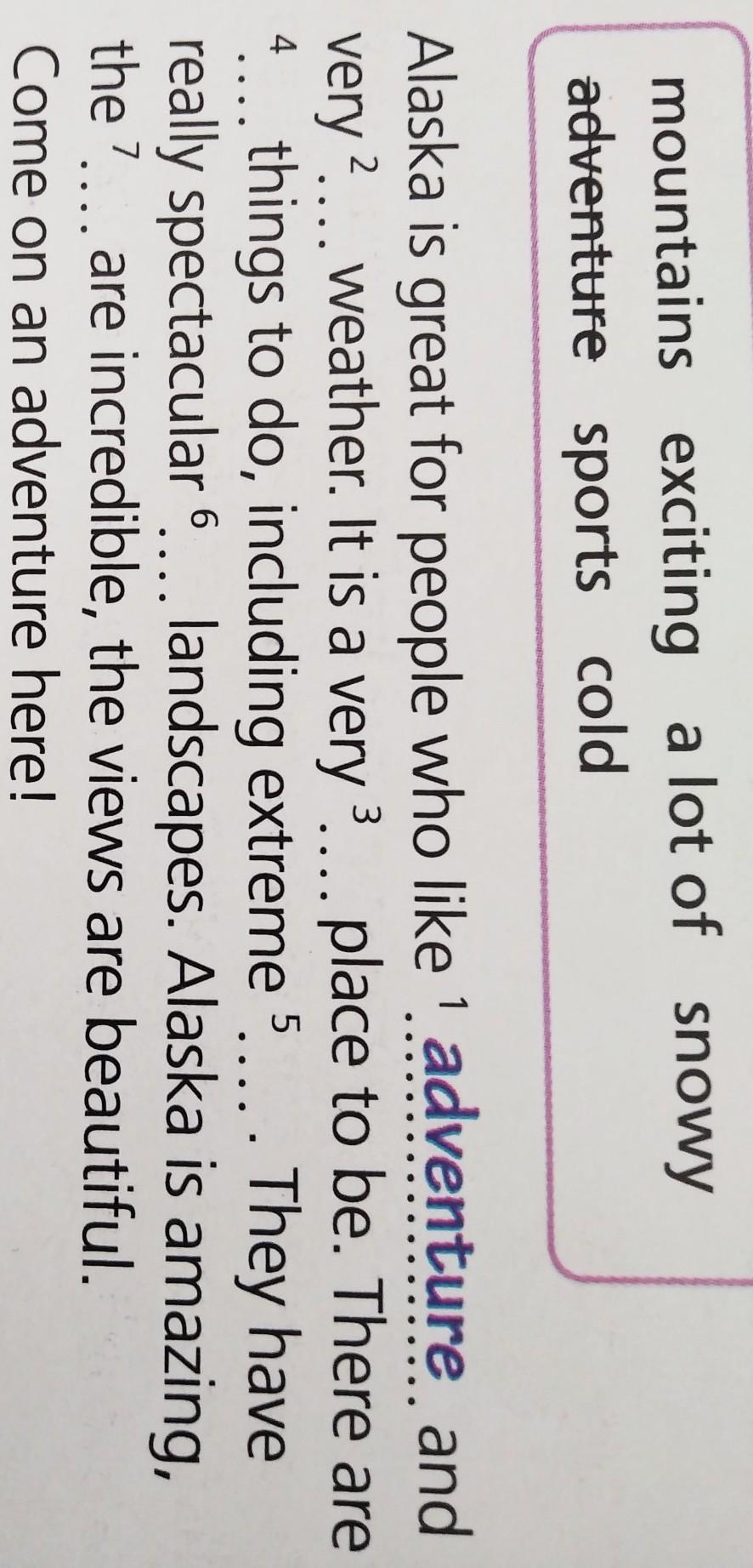 Alaska is great for people who like adventure and very COLD weather. It is a very EXCITING place to be. There are A LOT OF things to do, including extreme SPORTS. They have really spectacular SNOWY landscapes. Alaska is amazing, the MOUNTAINS are incredible, the views are beautiful. Come on an adventure here!