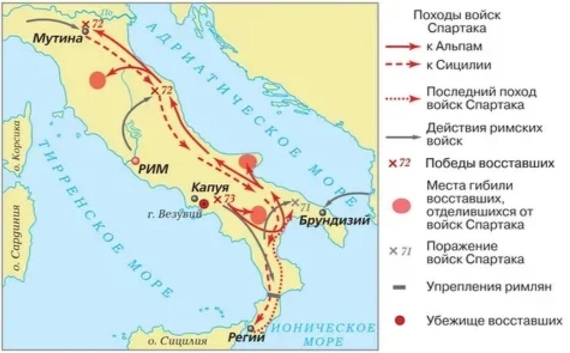Благодаря этой первой победе, а также благодаря справедливости лидера восставших (он делил добычу со всеми поровну), мятеж Спартака охватил весь юг Италии. Спартак собирался уйти со своими воинами через Альпы в Галлию или на Пиренейский п-ов, чтобы примкнуть к Квинту Серторию, но им перегородили путь две консульские армии (Корнеллия Лентула и Л. Геллия), которые тоже были разгромлены спартаковцами. Но после этой битвы, мятежники резко изменили свои планы (то ли потому, что мятеж Сертория уже был подавлен, то ли потому, что разгоряченные победами соратники Спартака решили, что они смогут захватить Рим), и направились на юг, в сторону столицы. В это время Марк Красс, крупнейший и богатейший землевладелец, организовал большую армию с жесткой дисциплиной, чтобы противостоять восставшим. Спартаковцам пришлось сменить курс в сторону острова Сицилии. Когда мятежники собирались переправиться на Сицилию, оказалось, что пираты, к-ые должны были организовать переправу, бросили их.