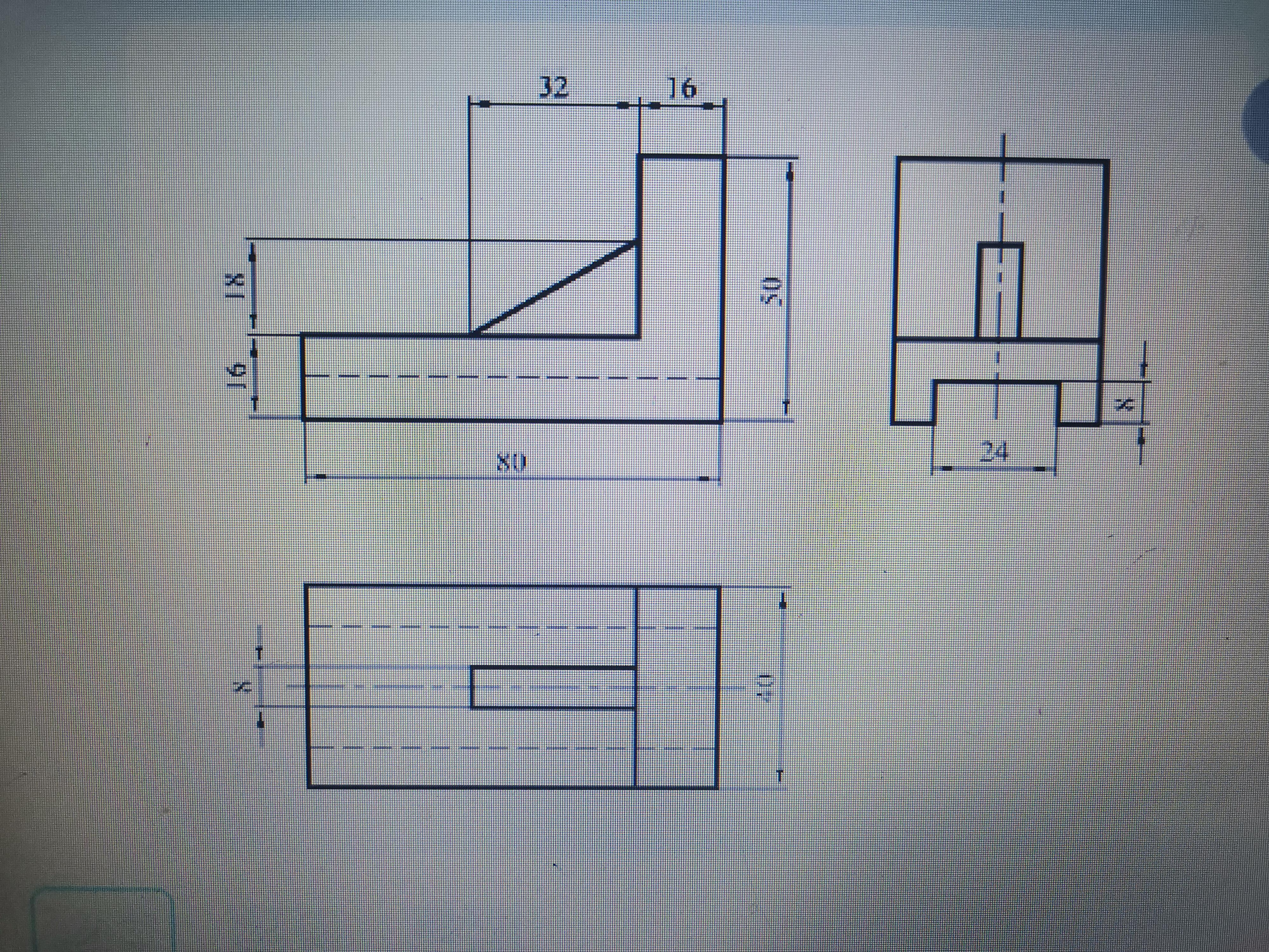 По данному виду и наглядному изображению постройте ещё два вида детали, очерченных габаритными рамками.
