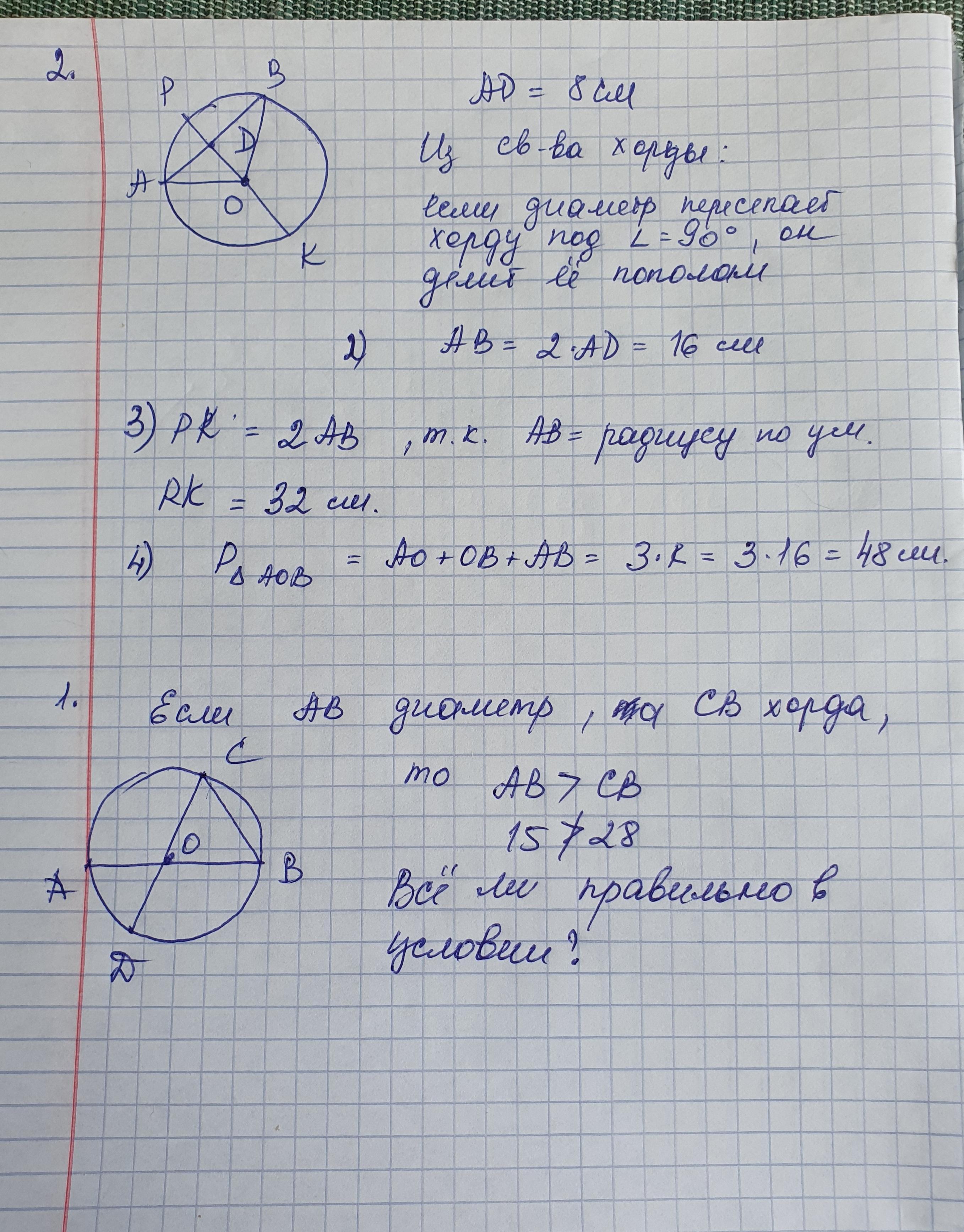 2. В окружности с центром в точке О к хорде АВ , равной радиусу окружности, перпендикулярно проведён диаметр РК. Диаметр РК и хорда АВ пересекаются в точке D. Длина отрезка AD=8см.