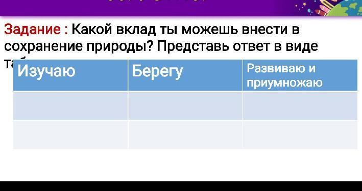задание Какой вклад ты можешь внести в Сохранение и сохранение природы Представьте ответ в виде таблицы изучаю берегу развиваю и приумножаем
