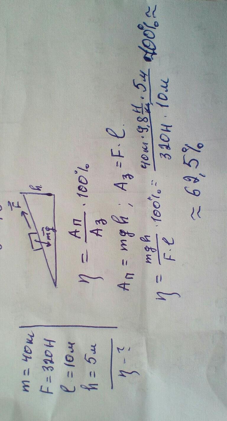 Рабочий поднимает по наклонной псорскоти груз массой 40 кг,прикладывая к нему силу 320Н,направленную вдоль плосколицая.Чему равен КПД плоскости,если её длина равна 10м,а высота 5м? МОЖНО С ДАНО И ФОРМУЛАМИ