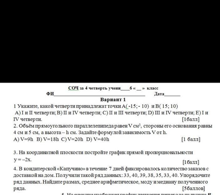 1 Укажите, какой четверти принадлежат точки А(-15;- 10) и В(15; 10) А)I и П четверти; В) П и IV четверти; С) I и Ш четверти; D) II и IVчетверти; Е)I и IV четверти