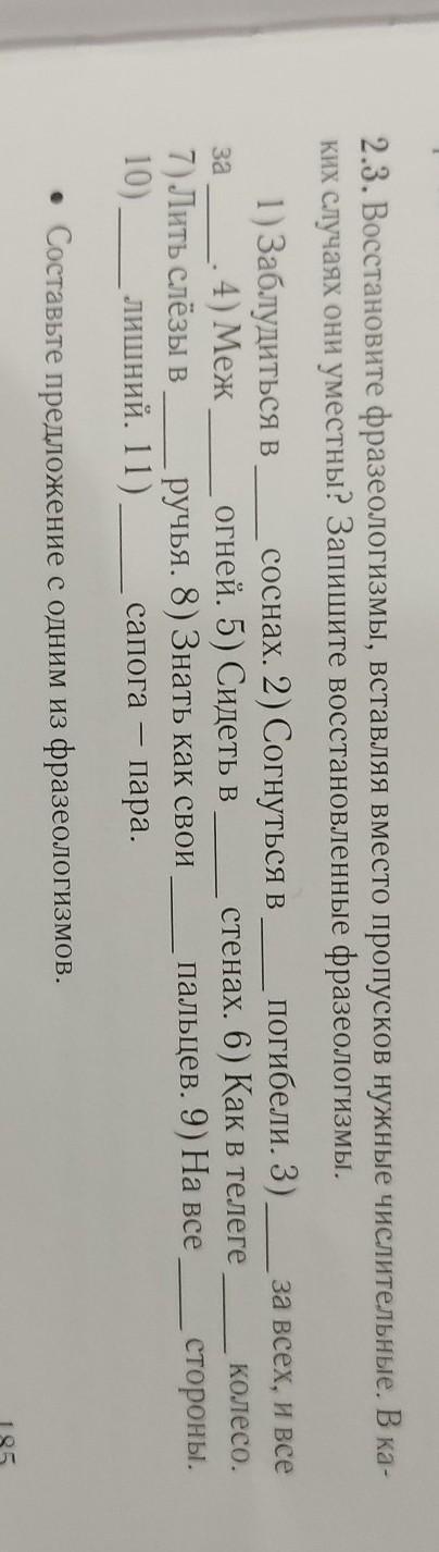 Заблудиться в трёх соснах. Согнуться в три погибели. Один за всех и все за одного. Между двух огней. Сидеть в четырёх стенах. Как в телеге пятое колесо. Лить слёзы в три ручья. Знать как свои пять пальцев. На все четыре стороны. Третий лишний. Два сапога —пара.