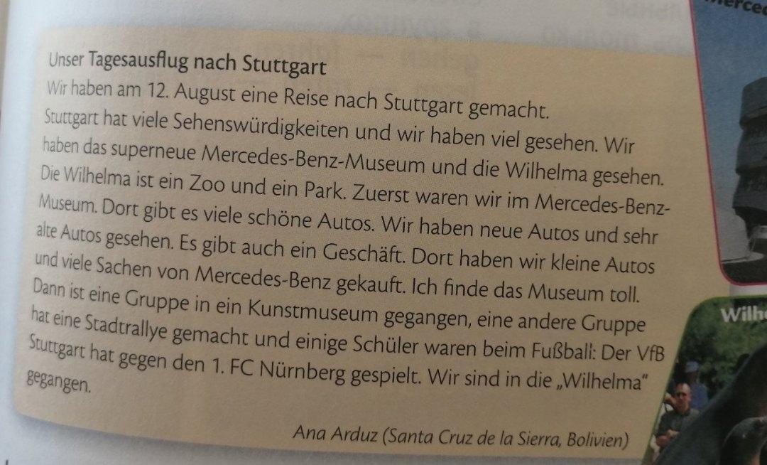 Мы совершили поездку в Штутгарт 12 августа. В Штутгарте много достопримечательностей, и мы многое видели, мы видели супер-новый музей Mercedes-Benz и Вильгельму. Вильгельма - это зоопарк и парк. Сначала мы пошли в музей Mercedes-Benz. Там много хороших машин. Мы видели новые машины и очень старые машины. Также есть магазин. Там мы покупали маленькие машины и много вещей от Mercedes-Benz. Я считаю, что музей отличный. Затем одна группа пошла в художественный музей, другая группа устроила городской митинг, а некоторые студенты играли в футбол: VfB augart играл против 1. FC Nürnberg. Мы пошли к Вильгельме.