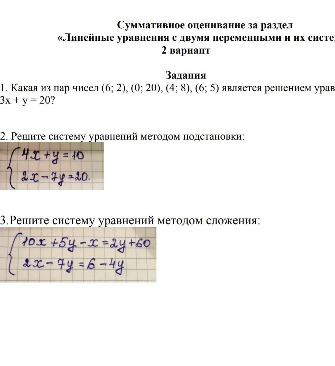 1. Какая из пар чисел (6; 2), (0; 20), (4; 8), (6; 5) является решением уравнения 3х + у = 20?