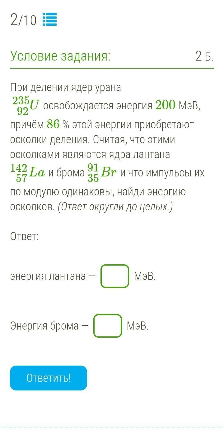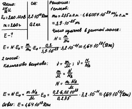 При делении ядер урана 23592U освобождается энергия МэВ, причём 86% этой энергии приобретают осколки деления
