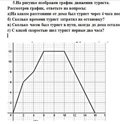 а)На каком расстоянии от дома был турпст через 4 часа после выхода из дома? б) Сколько времени турист затратил на остановку? Б) Сколько часов был турист в пути, акогда до дома осталось пройти 4км? г) С какой скоростью шел турист первые два часа?