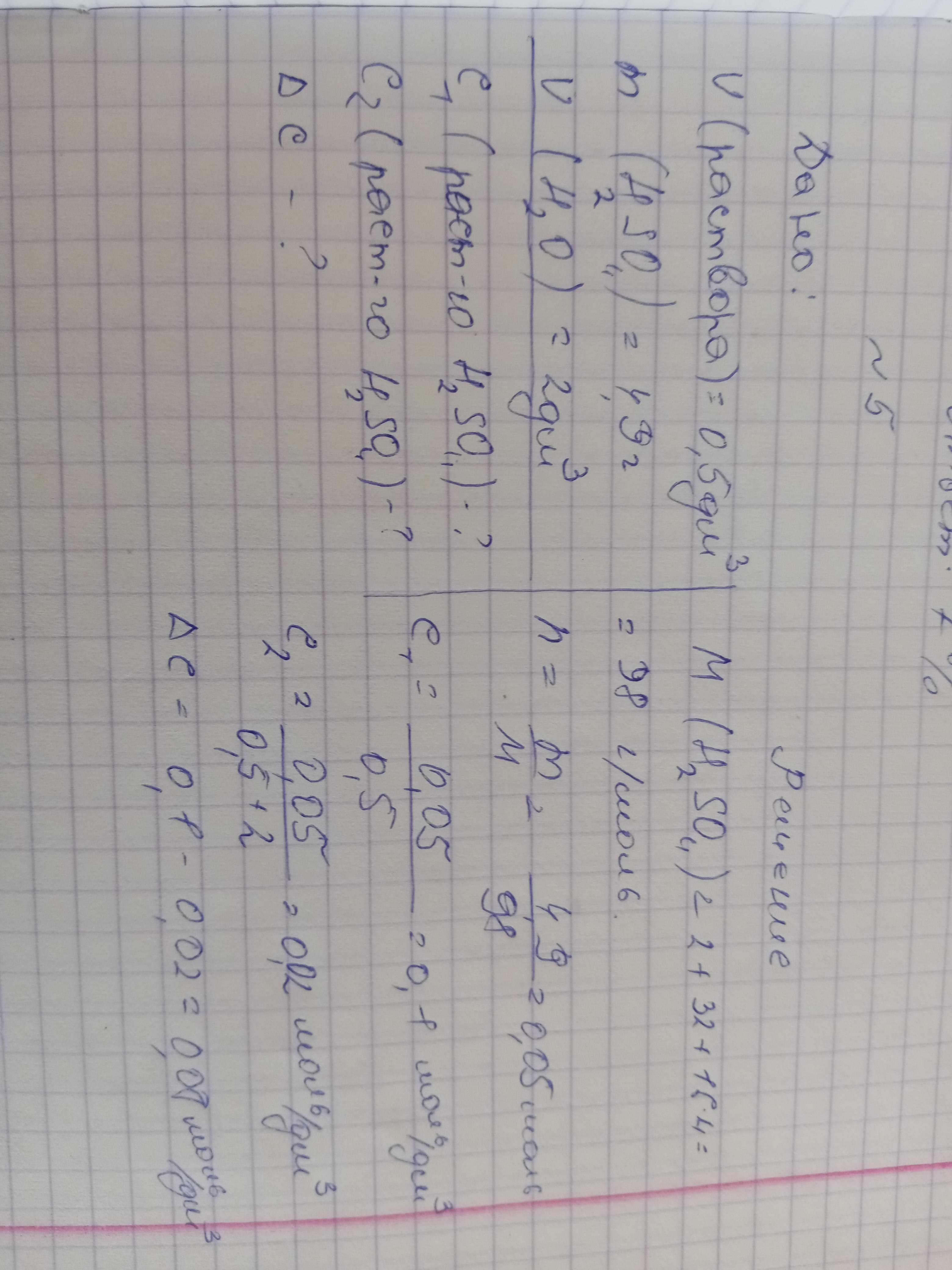 В растворе объемом 0,5 дм3 содержится серная кислота массой 4,9 г. Как изменится молярная концентрация растворенного вещества после добавления к данному раствору воды объемом 2 дм3? Плотность растворов считать равной 1 г/см3. Ответ подтвердите расчетами.