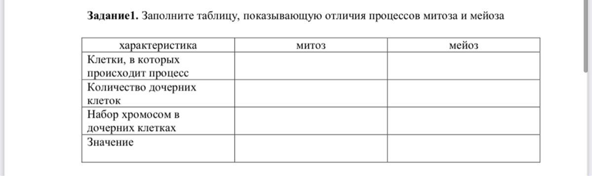 Заполните таблицу, показывающую отличия процессов митоза и мейоза