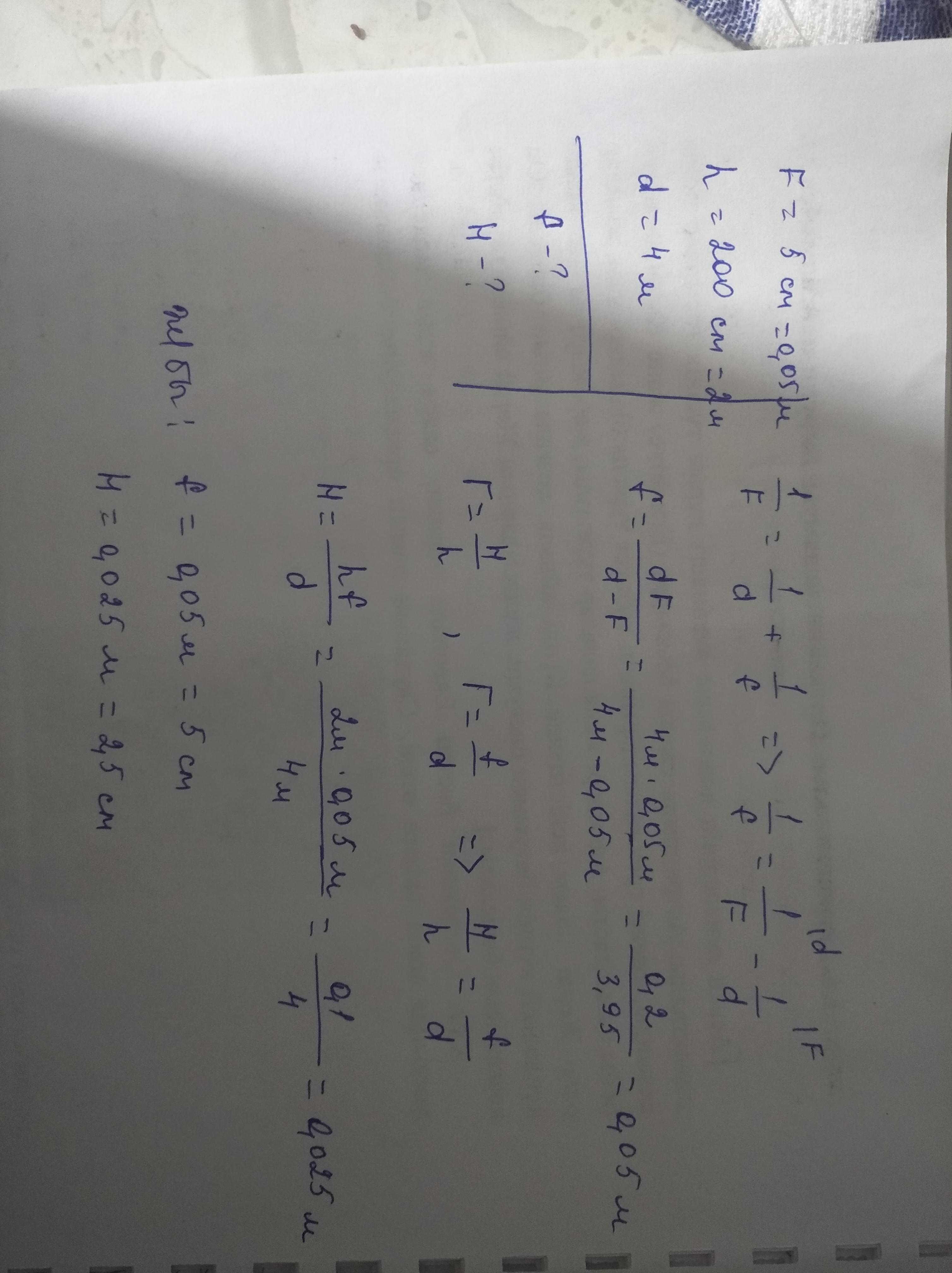 Расстояние фокусировки составляет 5 см. Объект высотой 200 см находится на расстоянии 4 м от объектива камеры. Как далеко от объектива находится изображение и какова его высота на пленке?