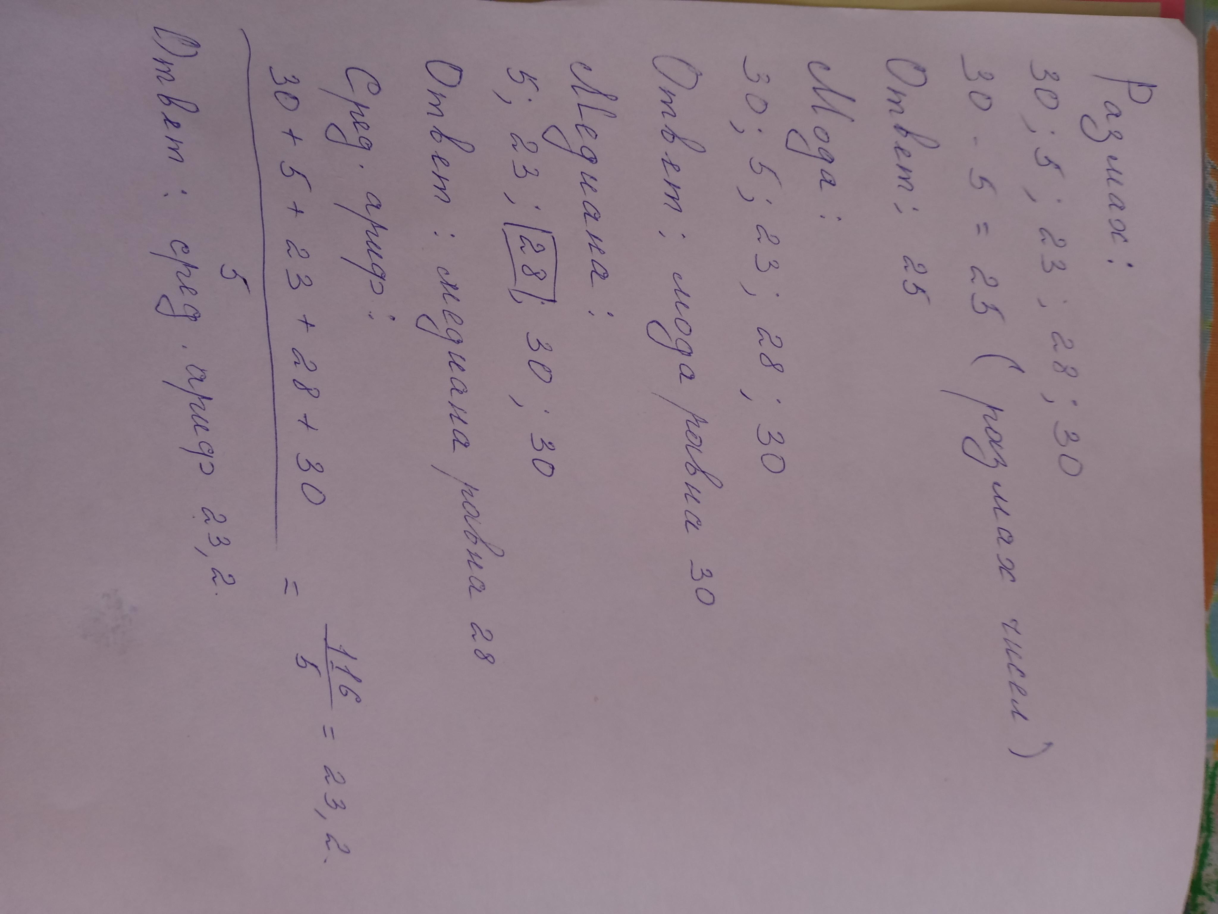 Задание 1. Найдите размах, моду, медиану и среднее арифметическое ряда чисел: а) 30; 5; 23; 28; 30;