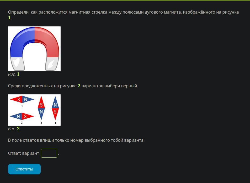 Определи, как расположится магнитная стрелка между полюсами дугового магнита, изображённого на рисунке 1.