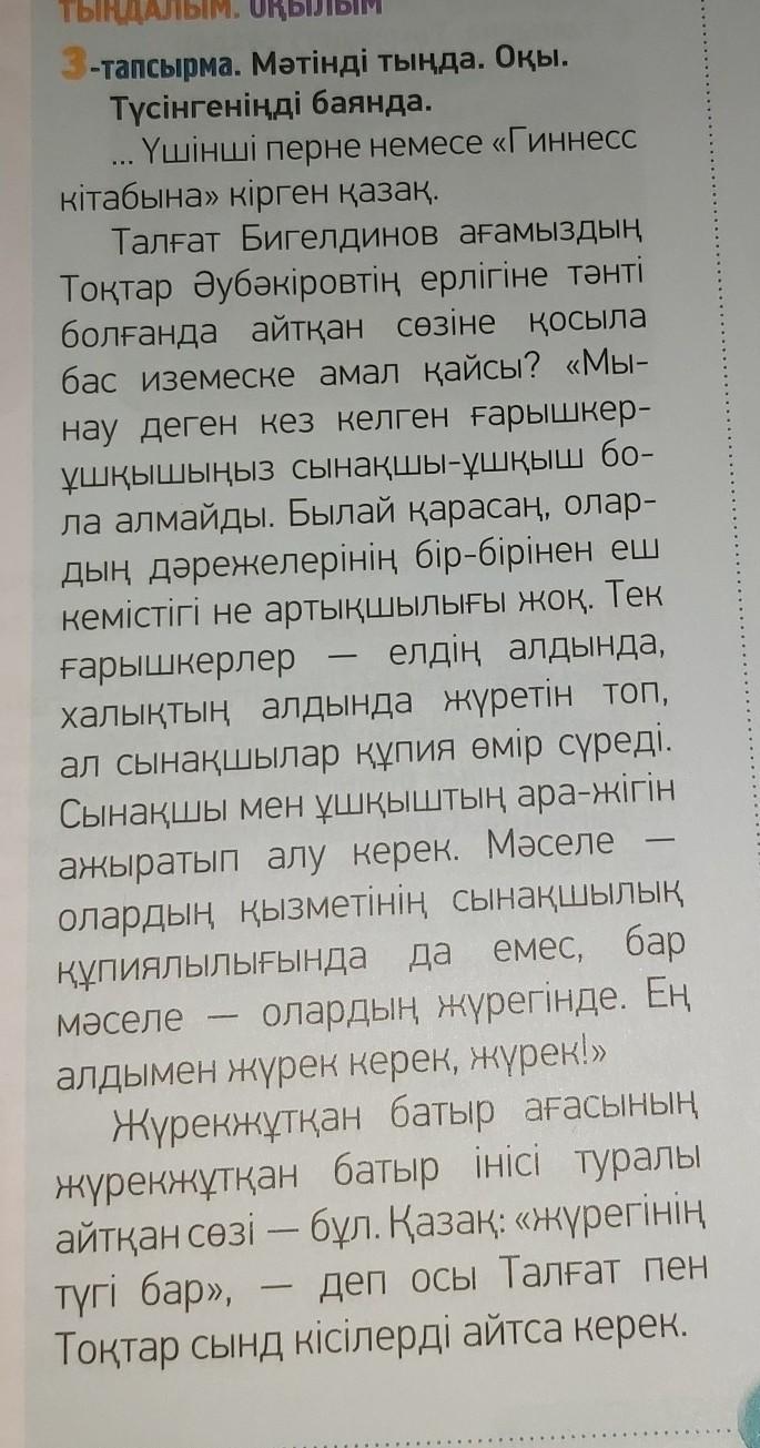 Ответ:1.Үшінші перне немесе Гиннес кітабына енген кім?2.Ғарышқа ұшу ұшын ең алдымен не керек?3.Ғарешкерлер кімнің алдында жүретін топ?4.Талғат Бигелдинев ерлігіне тәнті болған кезде айтқан сөзі?5.Талғат Бигелдинев кімнің ерлігіне тәнті болды?