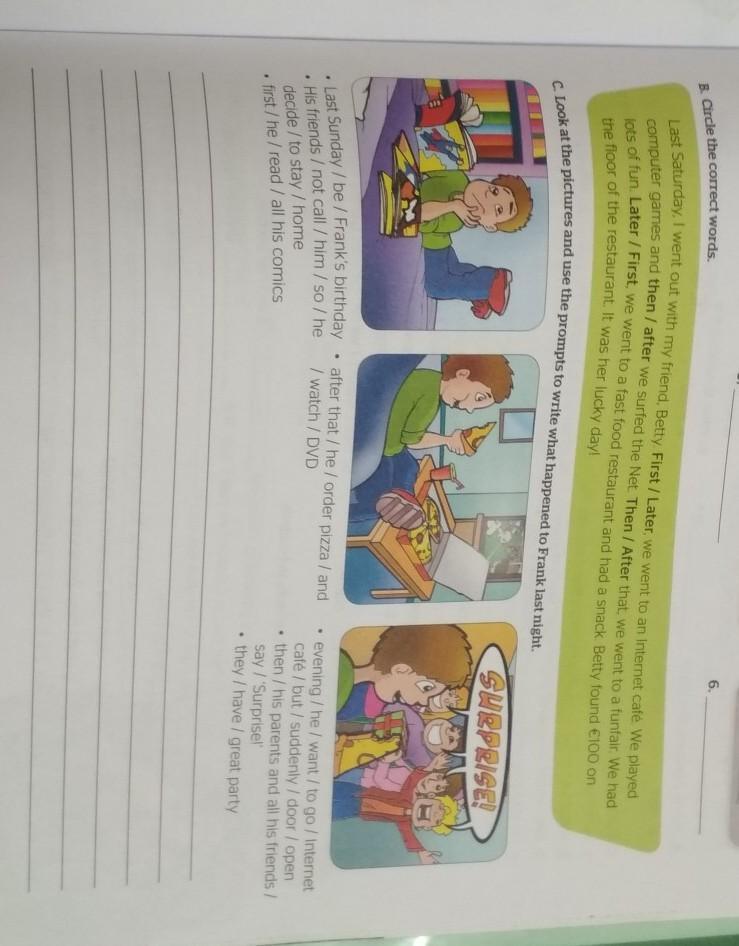 c. Last Sunday was Frank's birthday. His friends didn't call him so he decided to stay at home. First he read all his comics. After that he ordered pizza and watched DVD. In the evening he wanted to go Internet cafe but suddenly door opened. Then his parents and all his friends said "Surprise". They had great party.
