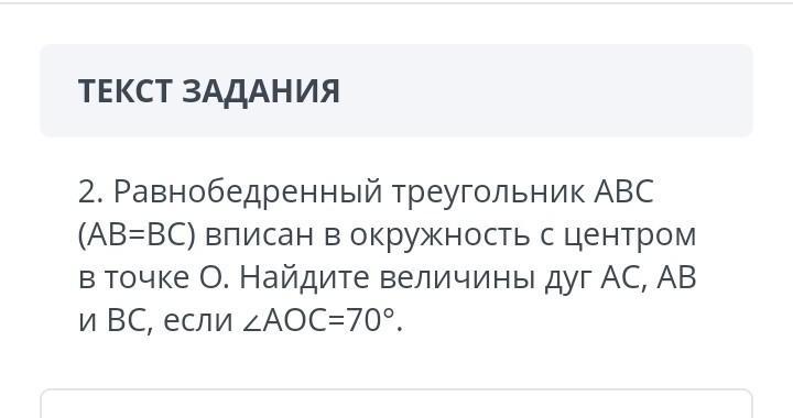 2) т. к. треугольник ABC — р/б, AB = BC — (по усл.), значит, дуга AB = дуге BC = (360 – 70)/2 = 145°