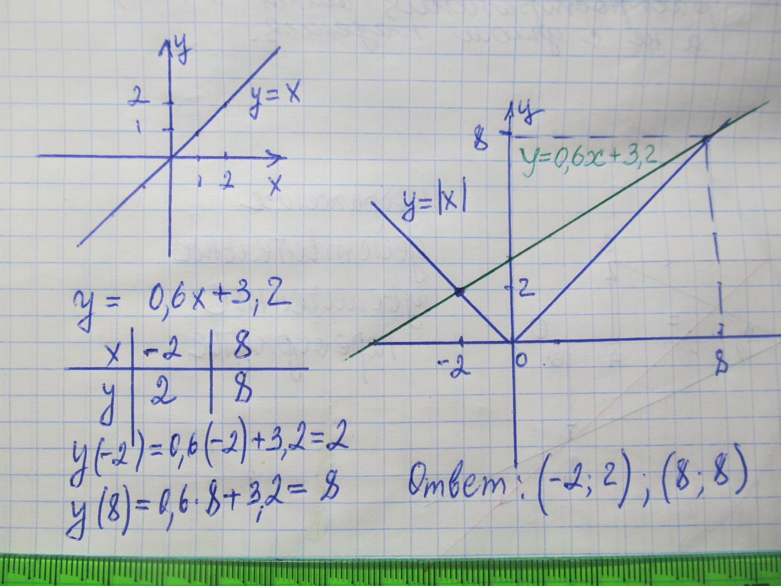В одной системе координат постройте графики функций y=|x| и y= 0.6x+3.2 и найдите координаты общей