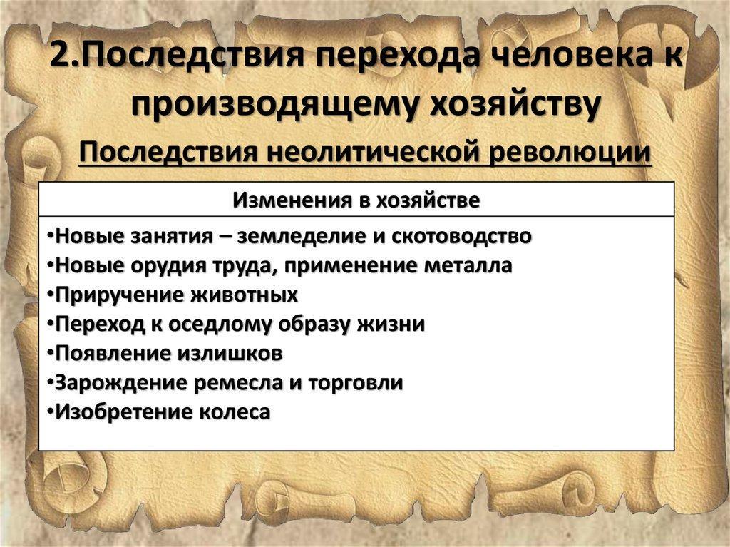 Неолит (8—3 тыс. лет до нашей эры) характеризуется завершением перехода к высшим формам присваивающего хозяйства и переходом к производящему хозяйству, т. е. основанному на производстве человеком материальных благ, необходимых для его жизни и деятельности.