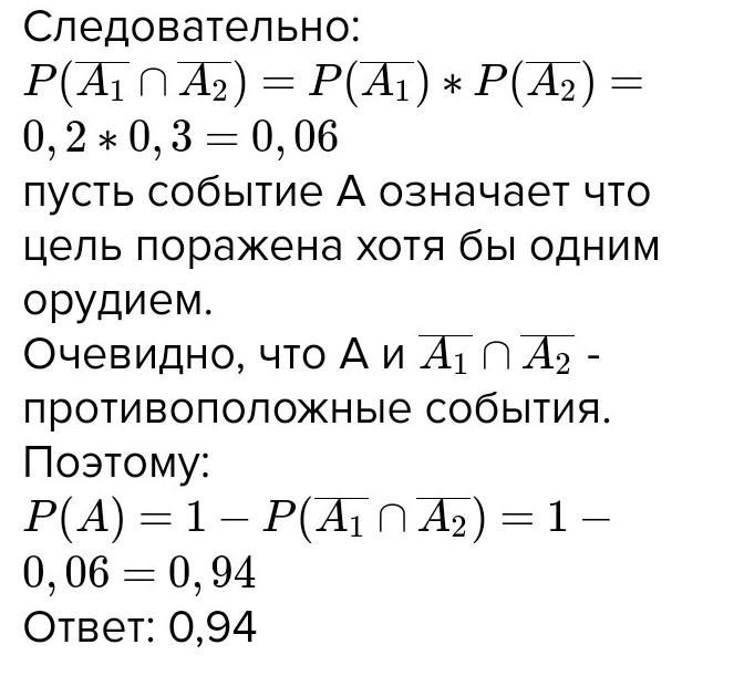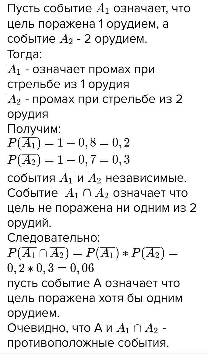 вероятность попадания в цель при стрельбе из первого орудия равна 0,8 , а при стрельбе из второго орудия равна 0,7. Найдем вероятность хотя бы одного попадания в цель, если каждое орудие сделало по одному выстрелу.