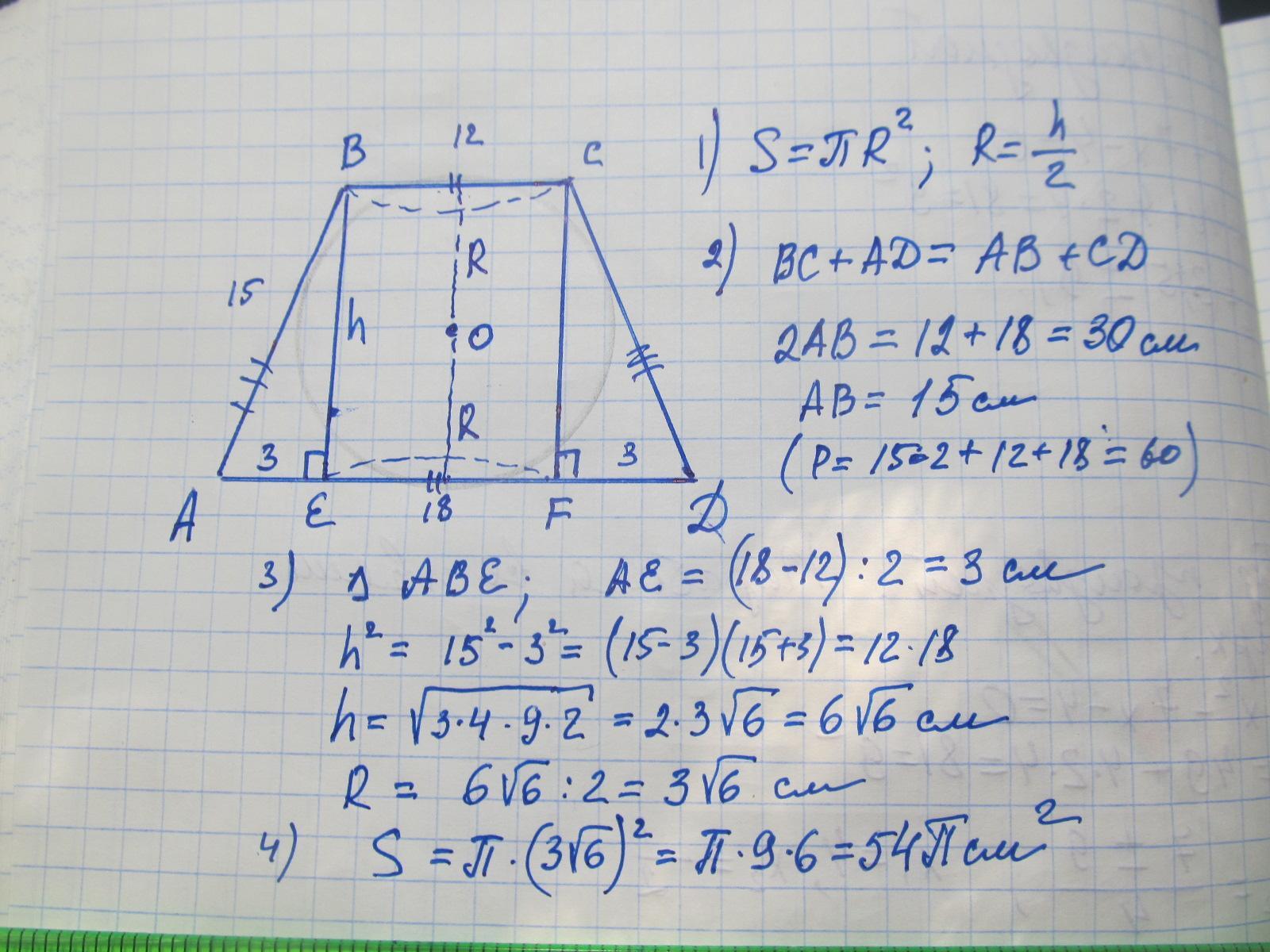 Проводишь перпендикуляры с углов от меньшей основы, те два маленьких отрезка по бокам большой основы равны (18 - 12) / 2 = 3. Теперь можно найти высоту. Корень из (15² - 3²) = корень из 216 - это диаметр окружности. Радиус равень корень из 54. Площадь равна П * r². Значит ответ 54П