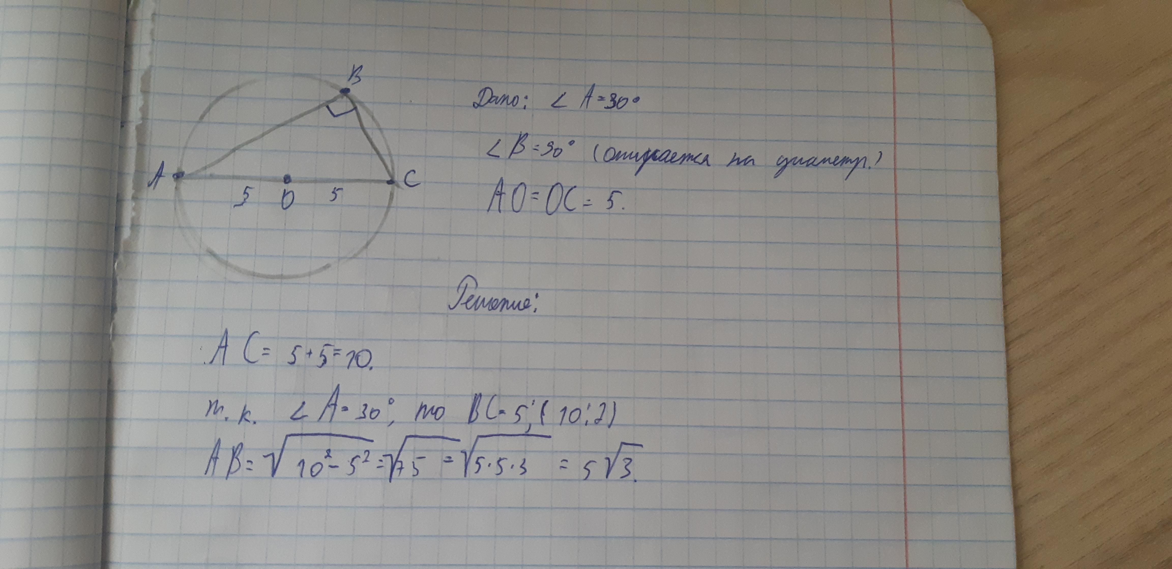 Определи длину хорды АВ,если она образует с диаметром АС угол 30°, и радиус окружности равен 5