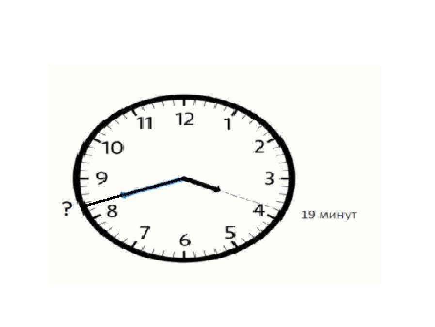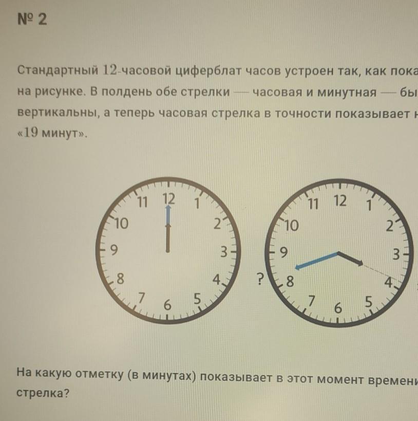 Стандартный 12 часовой циферблат часов устроен так, как показано на рисунке. В полдень обе стрелки-часовая и минутная-были вертикальны, а теперь часовая стрелка в точности показывает на отметку "19 минут"