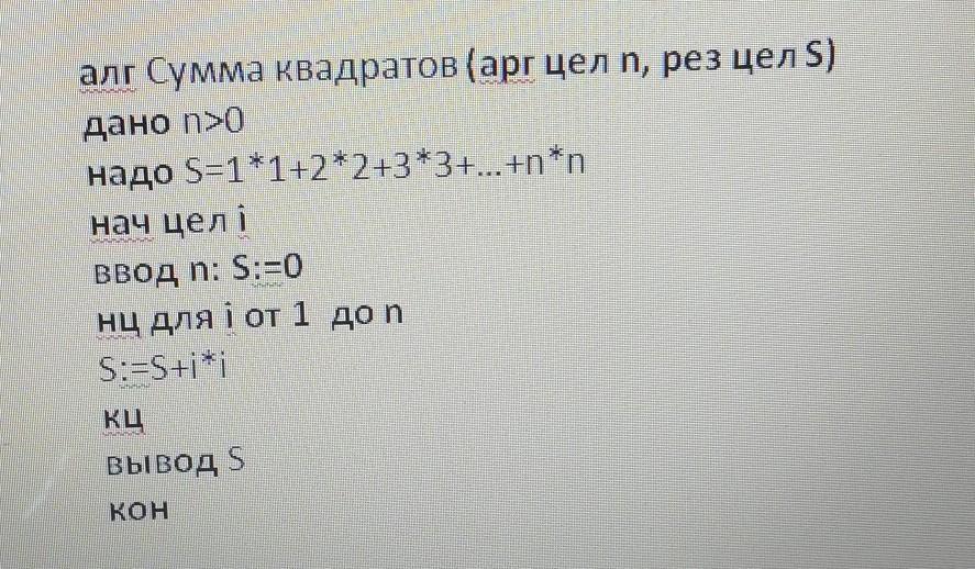 алг Сумма квадратов (арг цел п, рез цел S)