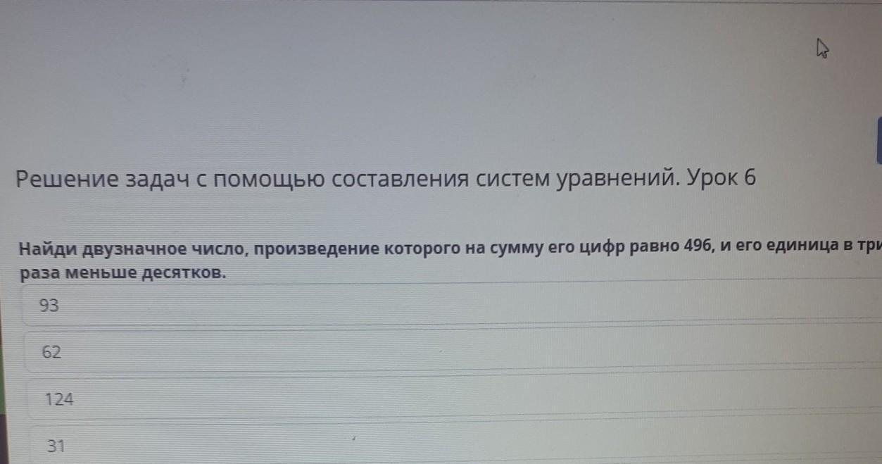 Найди двузначное число, произведения которого на сумму его цифр равно 496, его и среди них в три раза меньше десятков 93 62 124 31 39