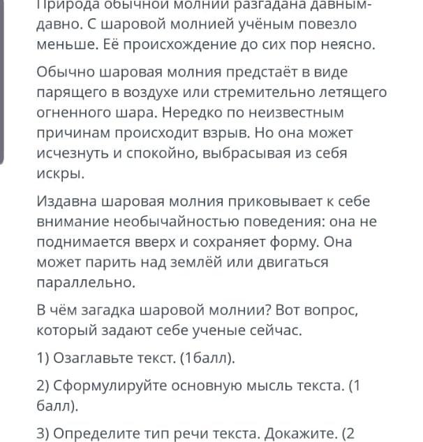 3) повествование. Доказательство: в тексте рассказывается о шаровой молнии, много имён существительных.