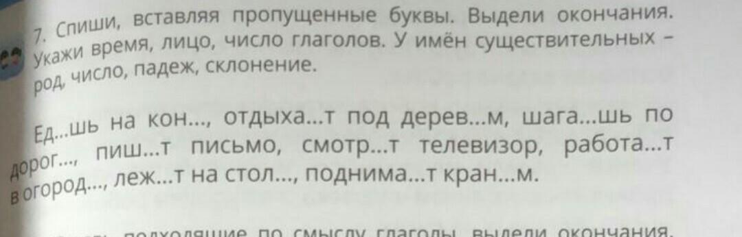 Едешь(н.в., 2 лицо., ед.ч) на коне(м.р., ед.ч., п. П), отдыхает(н.в., 3лицо., ед.ч) под деревом(ср.р., ед.ч., Т.п), шагаешь(н.в., 2лицо., ед.ч) по дороге(ж.р., ед.ч., Д.п), пишет (н.в., 2лицо., ед.ч) письмо(ср.р., ед.ч., И.п)