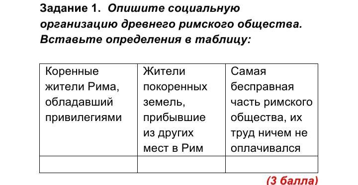 Коренные жители Рима, обладавший привилегиями Жители покоренных земель, прибывшие из других мест в Рим Самая бесправная часть римского общества, их труд ничем не оплачивался