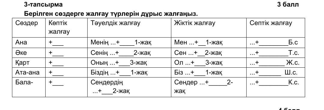 тәуелдік : анам, әкең, қарты, ата-анамыз, балаларың