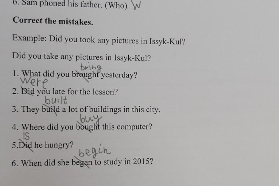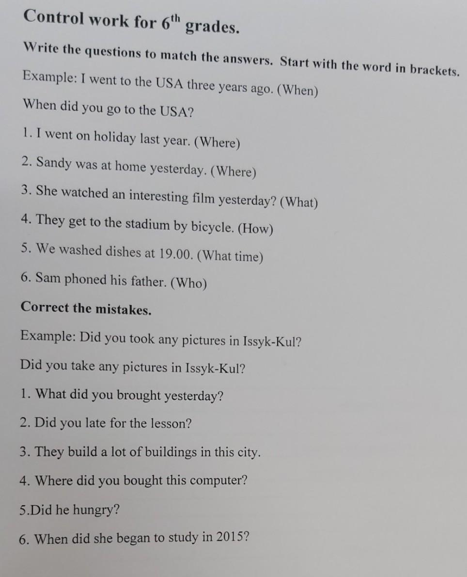 1)Write the questions to match the answers. Start with the word in brackets. 2)Correct the mistakes