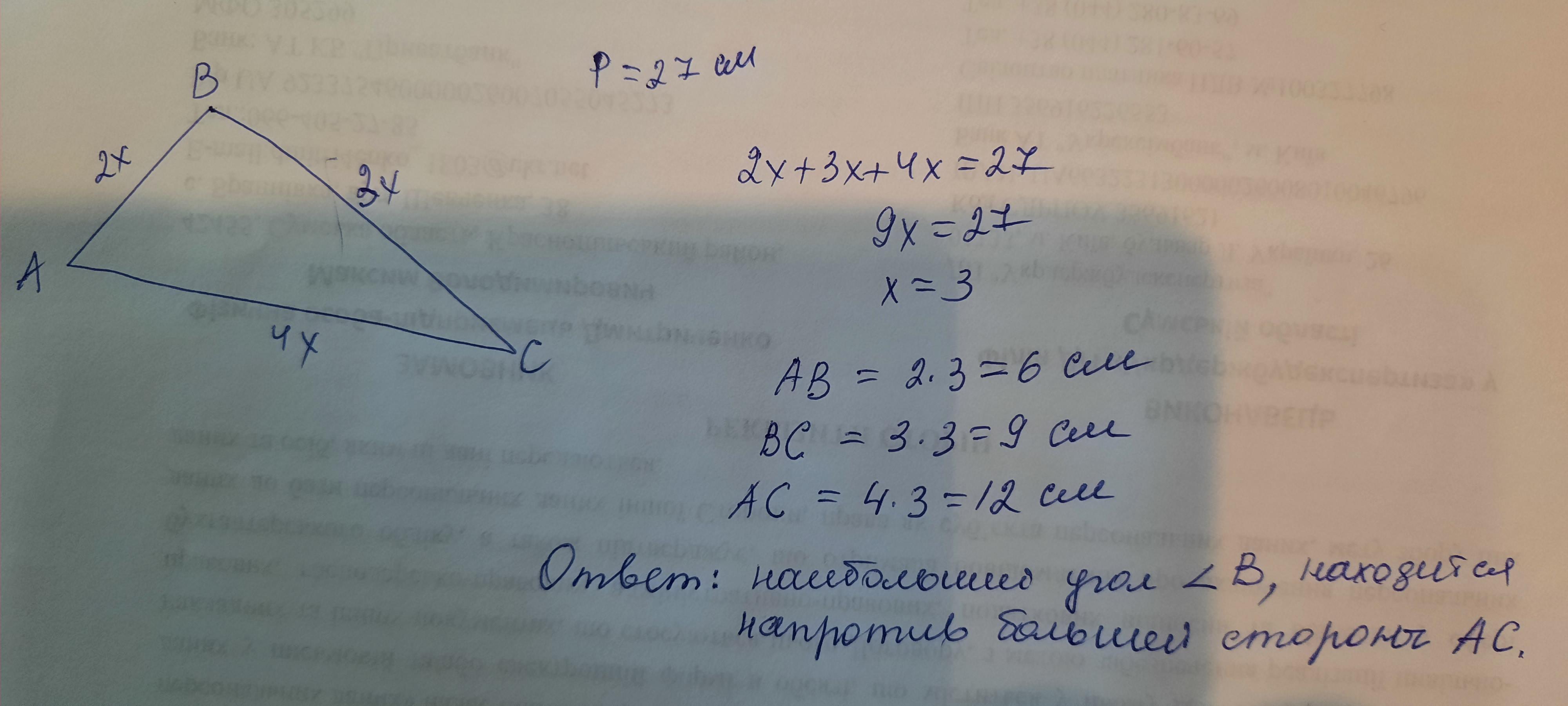 В треугольнике АВС АВ :ВС:АС=2:3:4 Р треугольника =27 см. Найти все его стороны и указать наибольшие угол