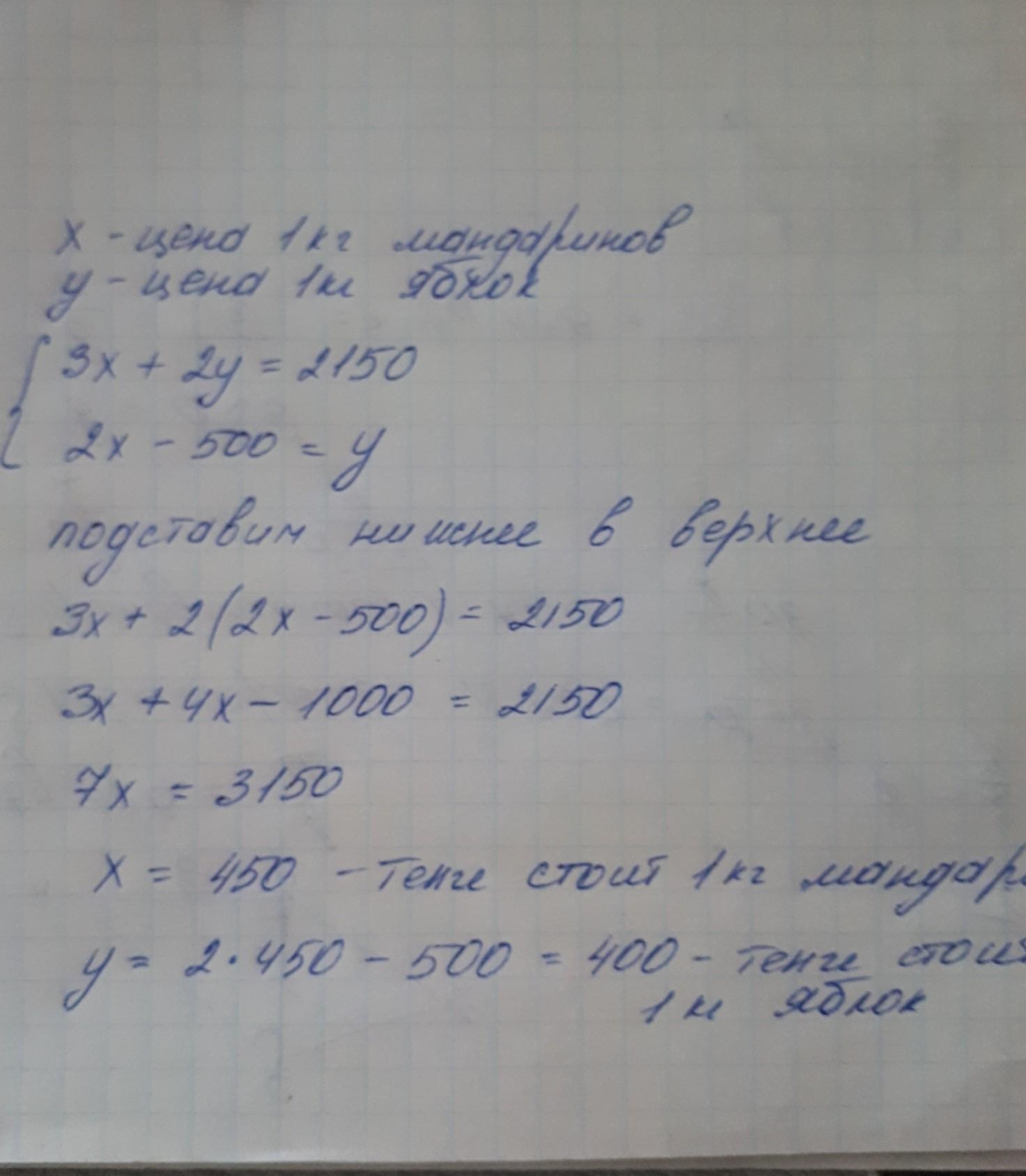 Решите задачу, составив систему уравнений:За 3 кг мандаринов и 2 кг яблок заплатили 2150 тенге. Сколько стоит 1 кг каждого вида фруктов, если 2 кг апельсинов на 500 тенге дороже, чем 1 кг яблок?