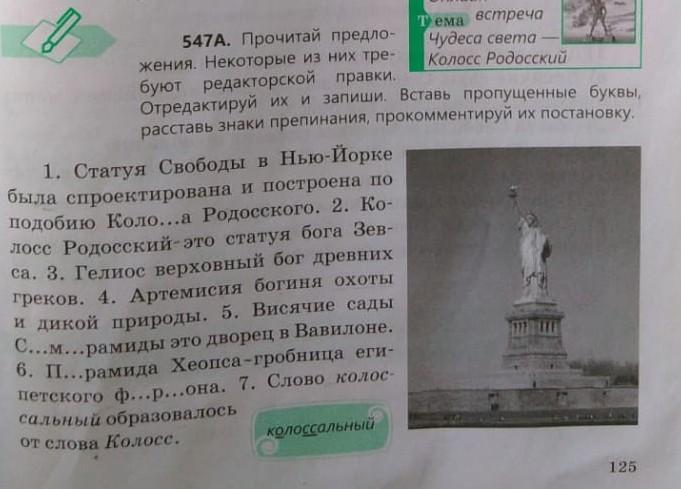 1 Статуя Свободы в Нью-Йорке была спроектирована и построена по подобию Колосса Родосского. 2. Колосс Родосский- это статуя бога Зевса. 3. Гелиос- верховный бог древних греков. 4. Артемисия богиня охоты и дикой природы. 5. Висячие сады Семирамиды- это дворец в Вавилоне. 6. Пирамида Хеопса- гробница египетского фараона. 7. Слово колоссальный образовалось от слова Колосс